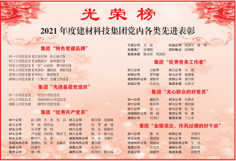 7月4日,上海建工建材科技集團召開(kāi)黨內先進(jìn)表彰會(huì )暨黨建品牌發(fā)布會(huì )。湖州公司榮獲2021年度上海建工建材科技集團“先進(jìn)基層黨組織”,姚紹武同志榮獲上海建工建材科技集團“業(yè)績(jì)突出、作風(fēng)過(guò)硬的好干部”,錢(qián)偉民同志、曾啟瑞同志榮獲上海建工建材科技集團“優(yōu)秀共產(chǎn)黨員”,劉秀紅同志榮獲上海建工建材科技集團“關(guān)心群眾的好黨員”。